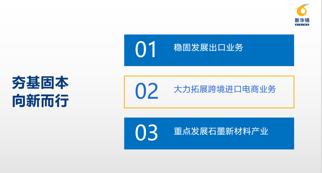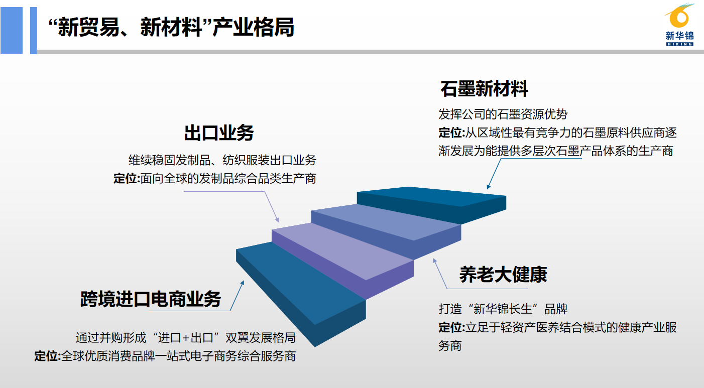 山東新華錦國際股份有限公司總部位于山東青島,是新華錦集團旗下A股上市公司。公司在國際貿(mào)易業(yè)務(wù)領(lǐng)域深耕多年,主營發(fā)制品和紡織品服裝產(chǎn)品的生產(chǎn)加工及業(yè)務(wù)出口業(yè)務(wù),同時布局了石墨新材料產(chǎn)業(yè)和跨境進口電商業(yè)務(wù),已逐步形成了“兩大核心戰(zhàn)略”“四個業(yè)務(wù)板塊”,初步建立了“新貿(mào)易、新材料”的產(chǎn)業(yè)格局。